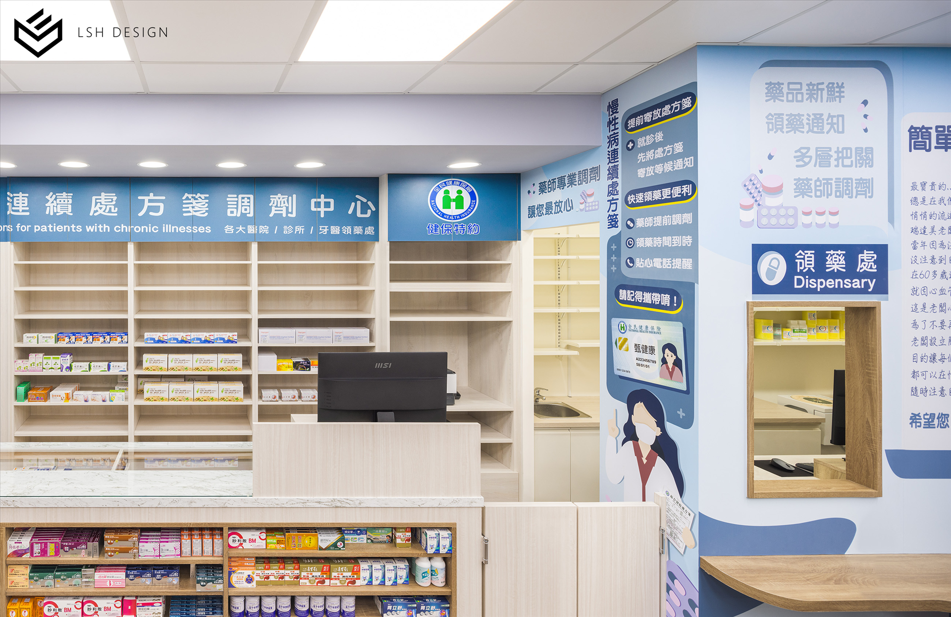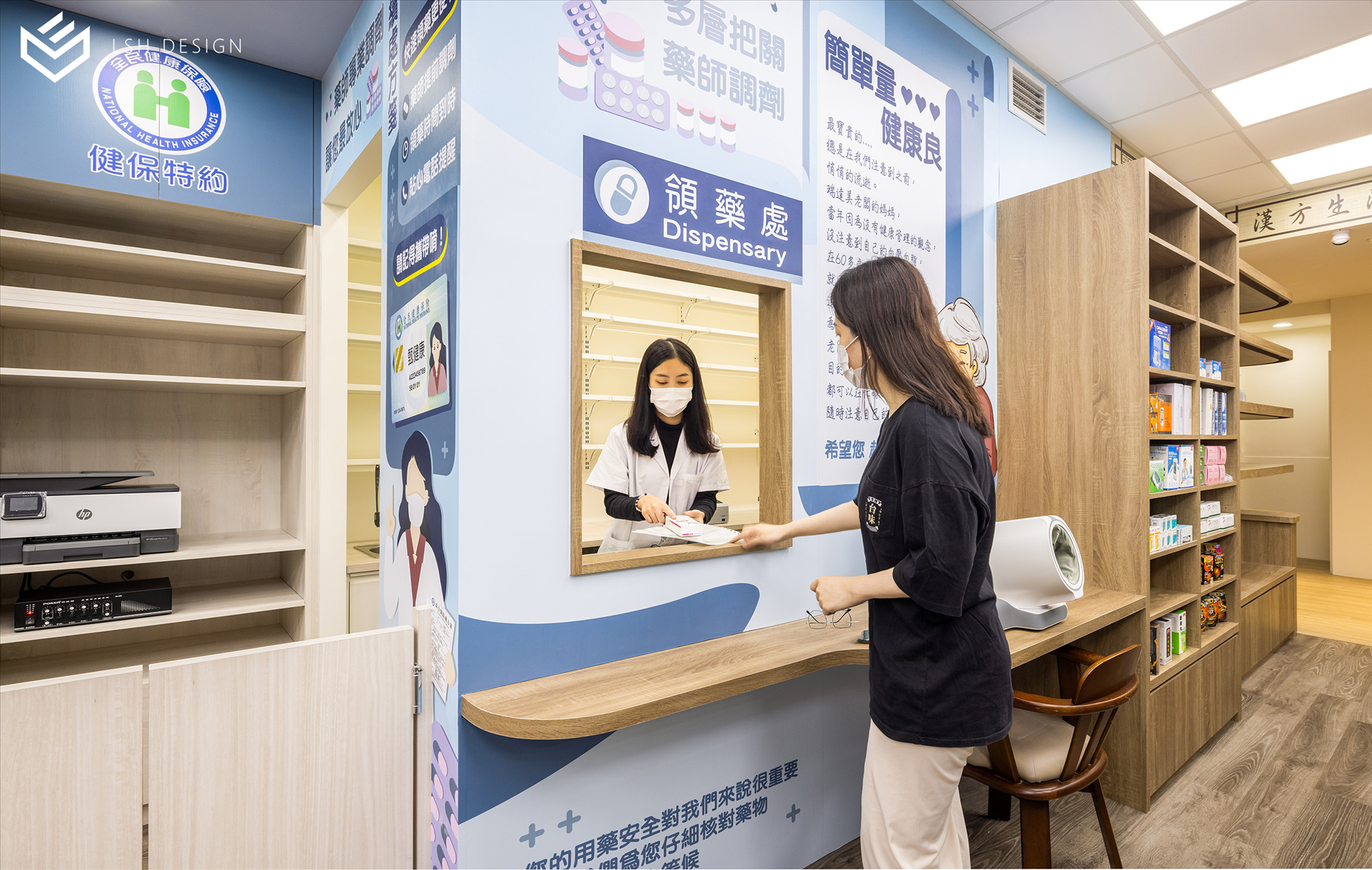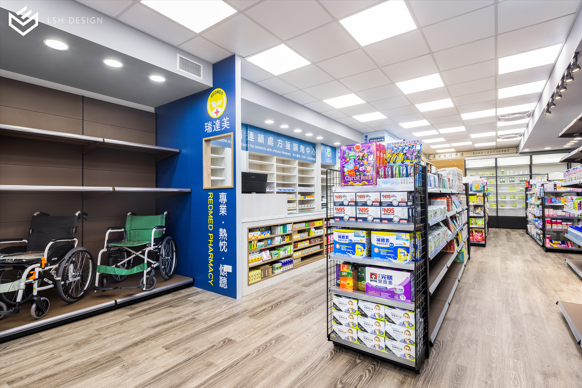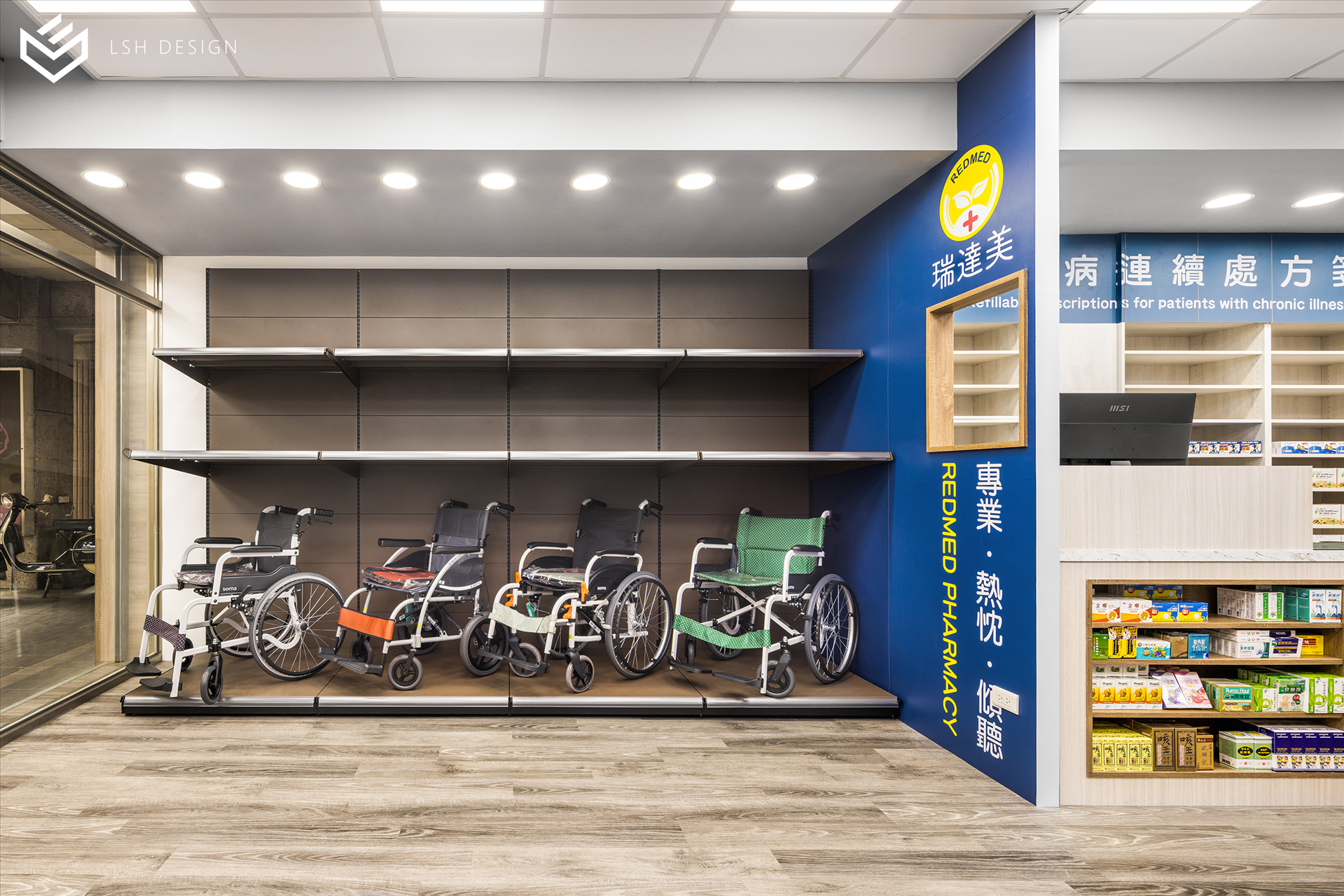 後段則是改變傳統中藥區域的刻板影響,選擇穩重的木皮色,減去空間泛黃感。